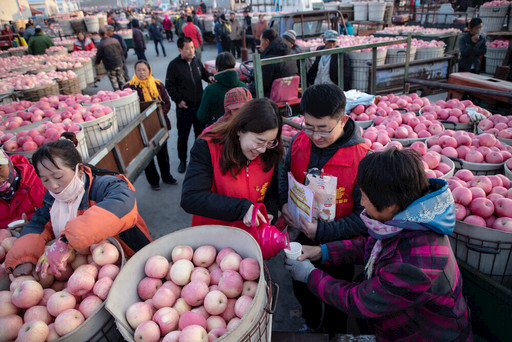 进入生产旺季,山东省栖霞市邮政分公司机关各职能部门、专业部门党员和入党积极分子共20多人组成了机关党员突击队,他们身着“党员志愿者”红马甲,活跃在苹果收购市场、街道小区、农户家中,支撑旺季业务发展,用实际行动践行了“一个党员就是一面旗帜”的庄严承诺。图为该分公司机关党员突击队到苹果收购市场,为果农送上暖手、暖身、更暖心的热水、热豆浆、热鸡蛋、劳保手套,帮助果农抬苹果,并提醒他们“苹果款要及时存到正规银行,以防被偷盗、被诈骗”。 □张红霞 唐子清 摄影报道