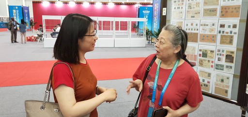 此次世界邮展评审委员会主任焦晓光(右)在展会现场接受《中国邮政报》特派记者王楚芸采访。
