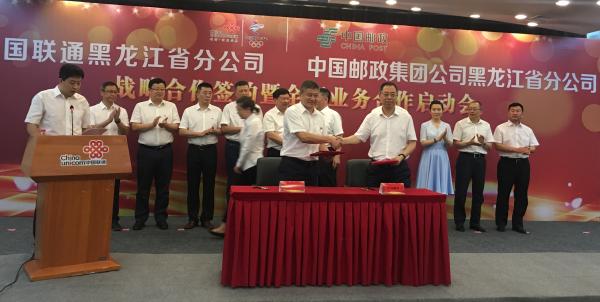 8月9日,中国邮政集团公司黑龙江省分公司与中国联合网络通信有限公司黑龙江省分公司就全面战略合作举行签约仪式。出席主会场签约仪式的有中国邮政集团公司黑龙江省分公司总经理刘斌、副总经理陈钊,省寄递事业部常务副总经理马葆生及各部门相关人员;中国联合网络通信有限公司黑龙江省分公司总经理刘炳坤、副总经理李春彦及各部门相关人员。分会场,双方各地市分公司总经理、分管副总经理及相关部门负责人参加会议。