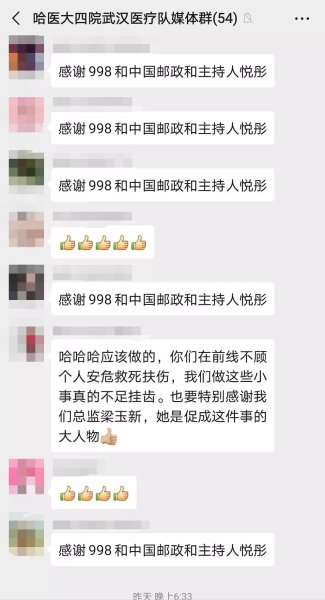 完成收寄服务,邮政工作人员与哈医大四院领导互道感谢。中心局指调中心任哲经理说:“放心,我们一定尽快让武汉的医务人员收到这批邮件。我们邮政就是为人民服务的,致敬白衣天使,他们是最伟大、最辛苦的!”医院领导说:“也请邮政工作人员做好防护,保护好自己才能更好的服务社会,共同抗击疫情离不开你们的帮助。”