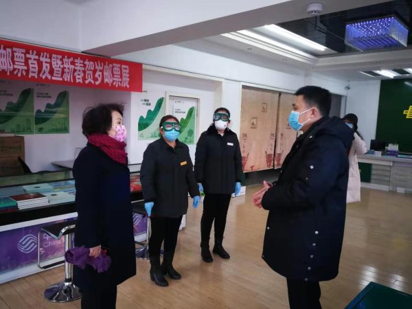 图为廖华荣副市长(右一)在邮政网点了解疫情期间的生产经营状况