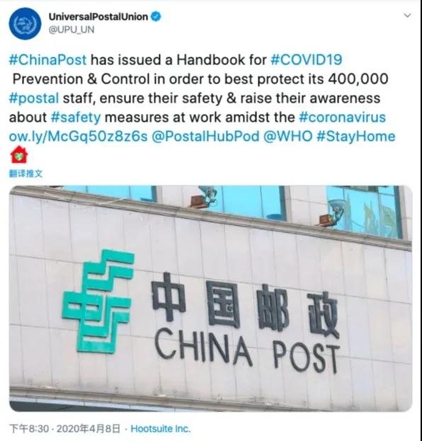 4月9日,万国邮政联盟在其官方社交媒体上发布了由中国邮政集团有限公司制作的《新冠病毒防护指导手册》英文版,向世界分享中国邮政的疫情防控经验。