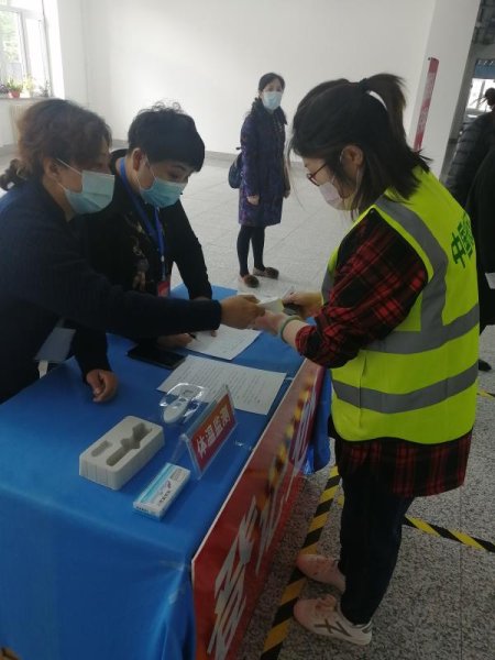 邮政工作人员在进入学生宿舍前做扫码、测温