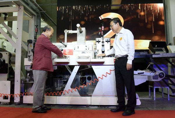 刘爱力(右)和冯大中共同启动邮票印制