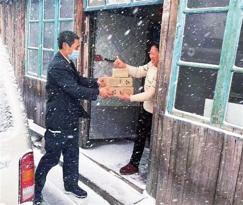 金树忠冒着风雪将快递包裹送至客户家中