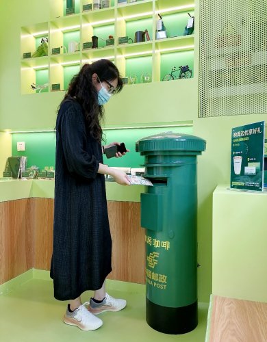 顾客在“邮局咖啡”投寄明信片。