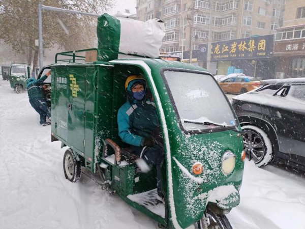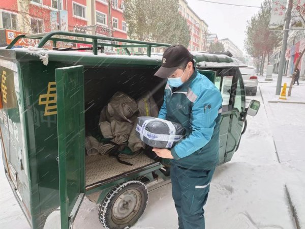 11月6日,黑龙江省发布暴雪红色预警,多地降水量已经达到10-61毫米,道路结冰,能见度低,风吹雪、雪阻现象严重。黑龙江省邮政分公司迅速启动地市、县、投递部三级应急预案,加密直达干线的运输频次,加密市内趟的运输频次。针对异常天气导致的邮路遇阻,各地市县邮政分公司灵活指挥调度,全力缓解运能压力,同时提前部署好邮车应急停靠场地及邮件临时储备场地。迎暴雪战旺季,各地邮政投递员们不畏艰难,以最快的速度,最暖的热情,在风雪中将邮件送到客户手中。