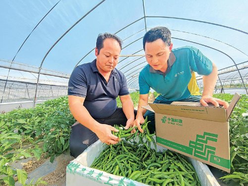 为了让育青合作社的辣椒更有品质,湘阴县分公司协同邮储银行湘阴县支行为马育青提供贷款20万元,用于改善大棚种植条件;在马育青的合作社有了一定规模后,为了提升合作社的抗风险能力、助其实现可持续发展,湘阴县分公司又逐步引导马育青将销售方式从线下批发转型到线上电商销售,并借助邮乐平台帮其打通了电商销售渠道;在寄递支撑上,每到销售旺季,湘阴县分公司都会组织人员来到育青合作社和工人们一起采摘辣椒、打包装车。从资金、销售到寄递,邮政为马育青提供了“一站式”的服务。
