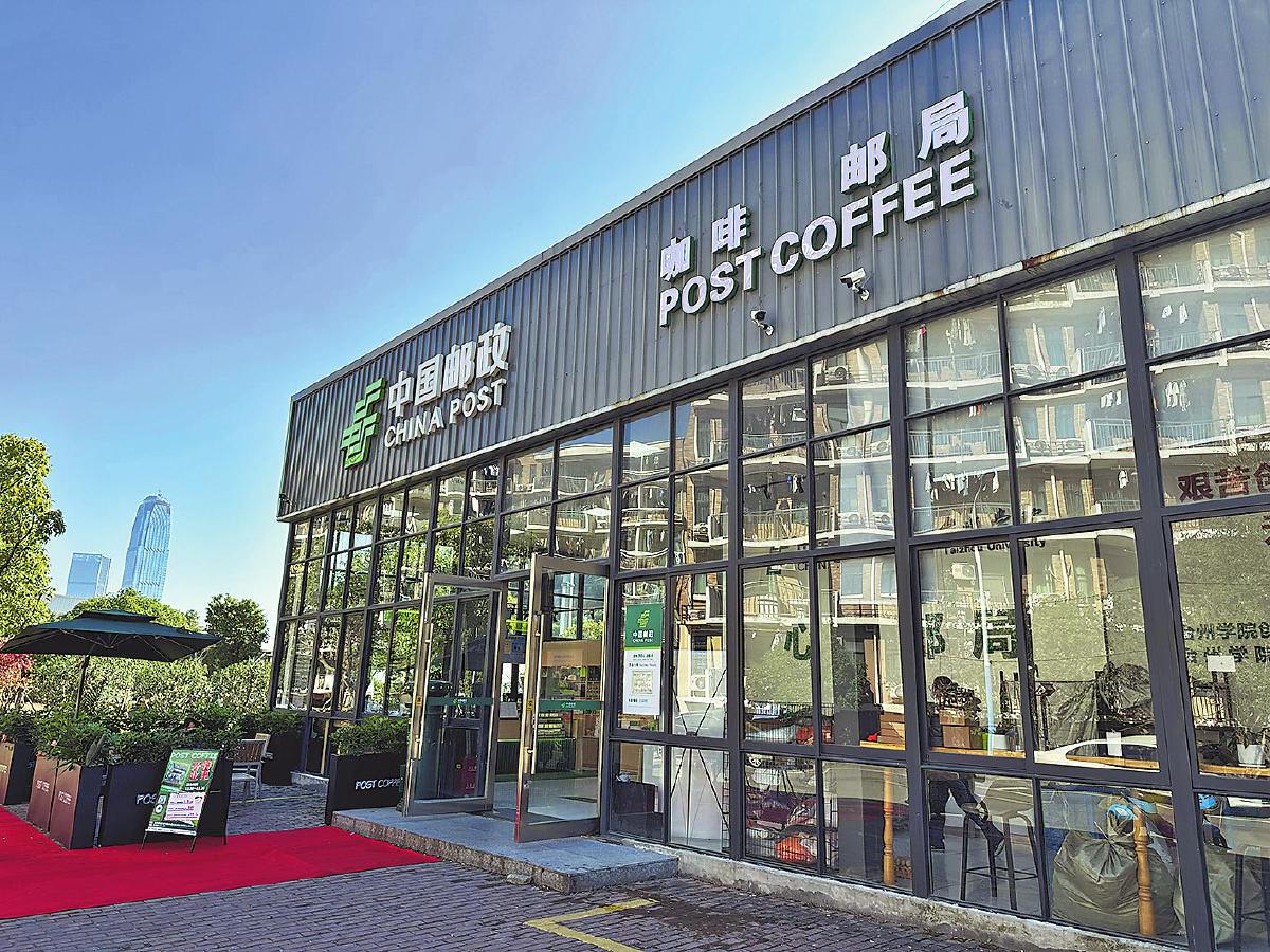 以邮政绿为主色调的咖啡邮局区域,设有咖啡运营区、文创区、休闲区。运营区内,一杯杯贴有“台州”城市专属邮票杯贴的咖啡,“邮政味儿”十足。在文创区的产品展示柜上,咖啡杯、咖啡壶、邮政托特包等周边产品琳琅满目。休闲区内,咖色系遮阳伞下方摆放着几组桌椅,供师生在此休憩。