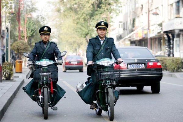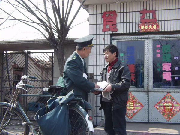 邮政人员骑着自行车送报纸