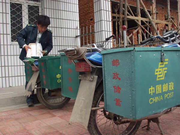 邮政人员骑着摩托车投递