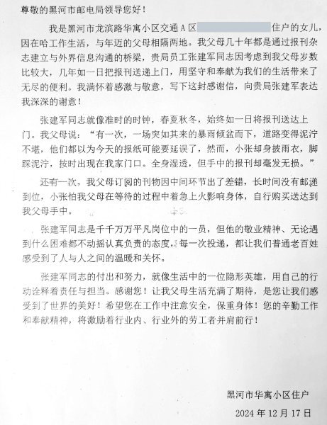 近日,黑河市邮政分公司收到一封情感真挚的感谢信,信中对投递员张建军多年来的坚守和奉献表达了深深谢意。