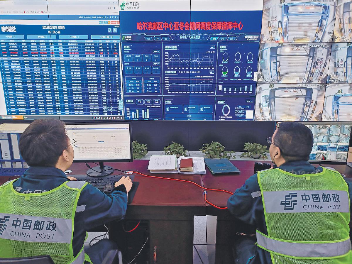 邮政工作人员在监控室护航亚冬会邮件安全。□罗辉 摄