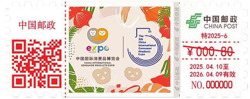 “第五届中国国际消费品博览会数字化彩色邮资机宣传戳”采用目前最新款TS71邮资机制作,每一枚戳的规格为72mm×28.5mm,面值为0.8元,使用期限为2025年4月10日至2026年4月9日,全国共发行12.1万枚。票面设计分为左中右三块区域,左侧印有“中国邮政”字样;中间区域为主图部分,展现的是消博会的吉祥物“元元”和“宵宵”拥抱的形象,吉祥物的原型是海南独有、世界珍贵的灵长类动物长臂猿,同时巧妙地融合了海南热带雨林的自然风光以及消博会5周年的标识,既展现消博会的精品路线定位,又蕴含了海南特色风貌;右侧的上方印有“中国邮政”字样及标识,下方则是资费及使用期限;中间主图及右侧之间印有邮政特殊金属防伪线。