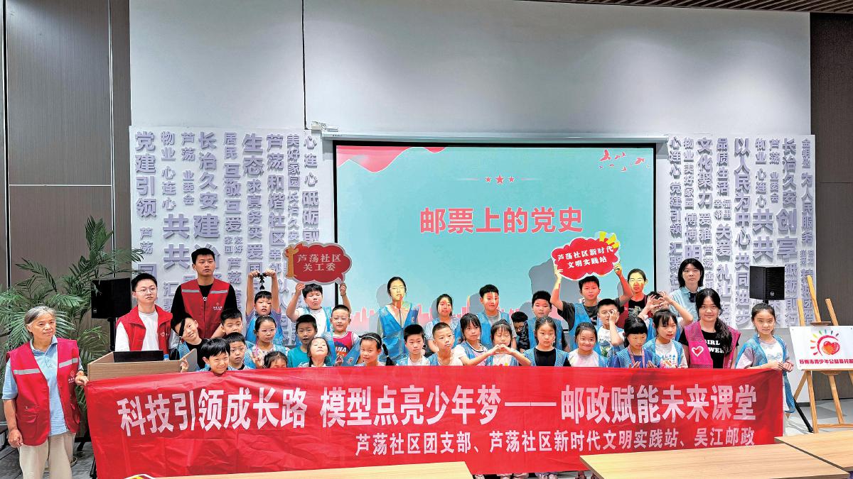 吴江邮政的党员志愿者通过一枚枚珍贵的邮票,向社区的青少年们讲述了中国共产党从诞生到进行革命斗争再到蓬勃发展的伟大历程。