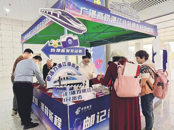 日前,广州至湛江高速铁路开通运营,为粤西地区经济社会发展注入新动能。湛江市邮政分公司在湛江北站设立临时邮局,推出通车纪念封和明信片。不少旅客现场书写明信片,加盖纪念邮戳,把“活力湛江”寄给亲朋好友。