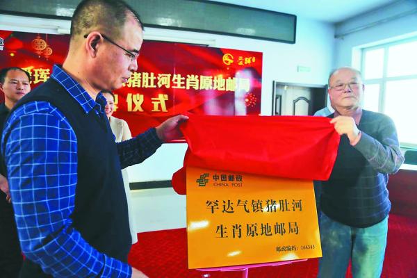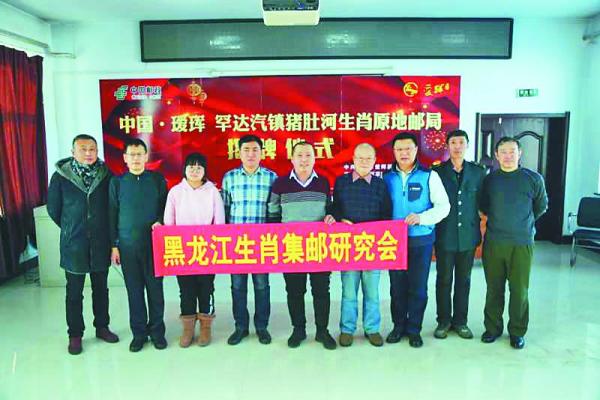 黑河市爱辉区罕达汽镇猪肚河村是入选全国生肖原地邮局之一的生肖邮局,黑河市分公司在爱辉区罕达汽镇举行了“猪肚子河生肖原地邮局”揭牌仪式。黑龙江省集邮协会牛炳仁副会长带领黑龙江生肖集邮研究会、黑龙江原地集邮研究会、外交邮品黑龙江研究会的会长及秘书长一行6人,前来参加了活动(图③)。