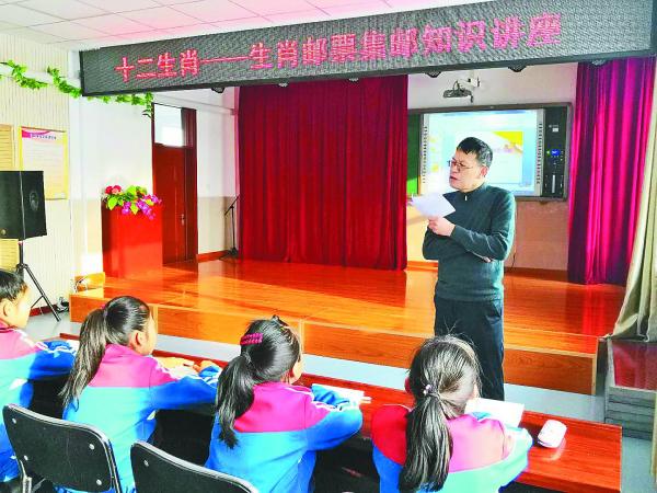 以黑龙江生肖集邮研究会何纪元会长为首的哈尔滨邮友,特地从省城赶到罕达汽镇“追戳”。他们1月4日就到达了黑河,当日应邀来到黑河市瑷珲镇中心学校,由黑龙江生肖集邮研究会秘书长刘振杰,为该校师生上了一堂生动的集邮讲座课(图⑤)。刘振杰秘书长以《十二生肖与生肖集邮》为题,从中国传统文化讲起,从生肖民俗,讲到生肖的集藏文化,由中、外发行的生肖邮票谈到中国传统文化的巨大影响力。刘振杰秘书长采用多媒体课件进行教学,图文并茂、由浅入深、引人入胜。师生们边听边记,听得情趣盎然,现场不时掌声阵阵。本次讲座不仅为瑷珲镇中心学校的师生们带来了集邮知识,也让师生们感受中华传统文化的巨大魅力。