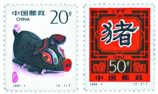 第二轮生肖猪票发行于1995年1月5日,题名《乙亥年》,志号1995-1,一套2枚。(2-1)“肥猪拱门”面值20分,图案形式为民间布玩具,图中的小猪拱肩、探首、耸鼻、翘嘴,把肥猪拱门的姿态表现得栩栩如生,呼之欲出。(2-2)“喜迎新春”面值50分,主图是一方勾以白边的黑色隶书“猪”字窗纸,配以桔红色的古朴民居窗格,洋溢出欢快、祥和的节日气氛。窗格两侧的“双猪图”窗花,寓意农业的畜牧兴旺(图②)。