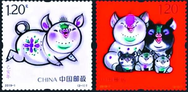 1月5日,我国发行第四轮生肖猪票,题名《己亥年》,志号2019-1,一套2枚,分别是“肥猪旺福”和“五福齐聚”,面值均为1.20元。第一图“肥猪旺福”中的肥猪肚藏乾坤,憨态可掬,以奔跑的动态表现灵动的喜感,象征着正在奔向幸福美好的生活。第二图“五福齐聚”刻画的是两只大猪和三只小猪,体现“全家福”的概念,以数字寓意长寿、富贵、康宁、好德和善终“五福”,寄托了阖家团圆、五福临门的美好祝福(图④)。